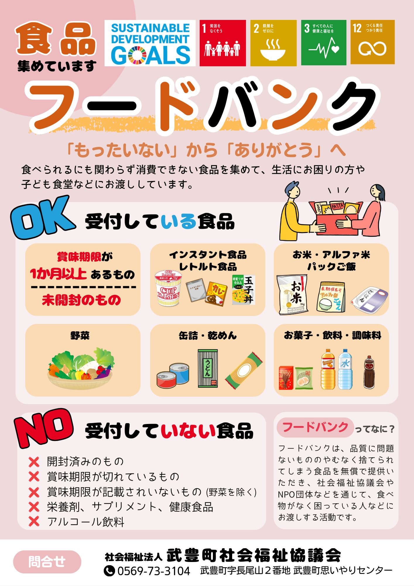 HOME > お知らせ > お知らせ フードバンク事業のご案内 更新日:2026年1月22日 ご家庭に眠っている食品はありませんか? 武豊町社会福祉協議会では、食べられるにも関わらず消費できない食品を集めて、生活にお困りの方や 子ども食堂などにお渡ししています。 Twitter シェア Google+ Pocket B!はてブ LINE -お知らせ