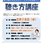 「聴き方講座」についてお知らせです。 講師に鹿児島国際大学 准教授 小松尾 京子先生を招いて、傾聴とはなにか、話を聞く・聴くのちがいはあるのか、学ぶことができます。 ※参加 ...